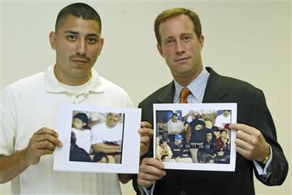 Juan Catalan, left, and his attorney Todd Melkin hold photos of a video taped by an independent television crew shooting scenes on location on an unrelated project for HBO ('Curb Your Enthusiasm'), at a news conference Wednesday, Aug. 4, 2004, in Encino, Calif. Catalan spent five months in jail on murder charges before his attorney found video footage taken by the show at Dodger Stadium that backs his client's claims of innocence. Police arrested Catalan in August, alleging he killed Martha Puebla, 16, in the San Fernando Valley on May 12, 2003, because she had testified against his brother in another case. Catalan insisted he and his 6-year-old daughter were watching the Los Angeles Dodgers lose to the Atlanta Braves, 11-4, minutes before Puebla was killed about 20 miles north of the stadium.