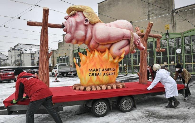A political carnival float depicting former US president Donald Trump is rolled out to be shown in the streets in Duesseldorf, Germany, Monday, Feb. 15, 2021. Because of the coronavirus pandemic the traditional; carnival parades are canceled but eight floats are pulled through the empty streets in Duesseldorf, where normally hundreds of thousands of people would celebrate the street carnival.