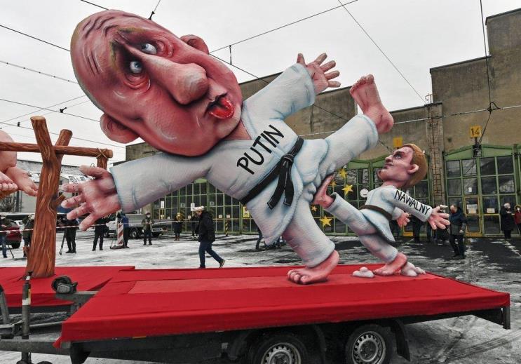 A political carnival float depicting Russia's President Vladimir Putin fighting with opposition Alexei Navalny is rolled out to be shown in the streets in Duesseldorf, Germany, Monday, Feb. 15, 2021. Because of the coronavirus pandemic the traditional; carnival parades are canceled but eight floats are pulled through the empty streets in Duesseldorf, where normally hundreds of thousands of people would celebrate the street carnival.