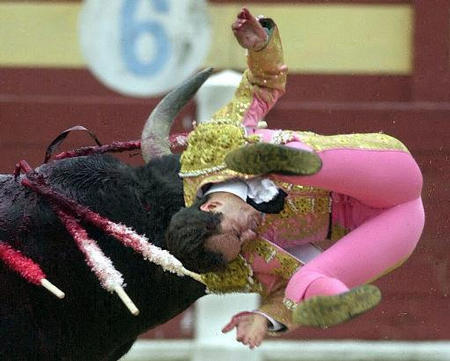 Bullfighter Alberto Ramirez is butted by a bull he was fighting during a corrida in Oviedo, northern Spain Sunday May 12, 2002. Ramirez escaped injury in the incident.