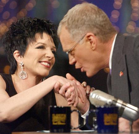 Liza Minnelli gets a kiss from CBS's "Late Show" host David Letterman during the taping of the show, Monday, May 13, 2002, in New York.