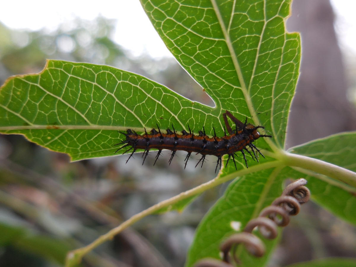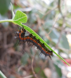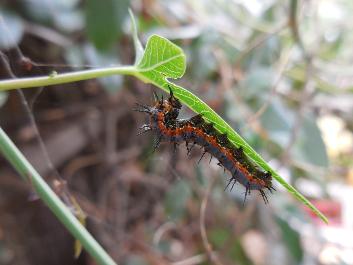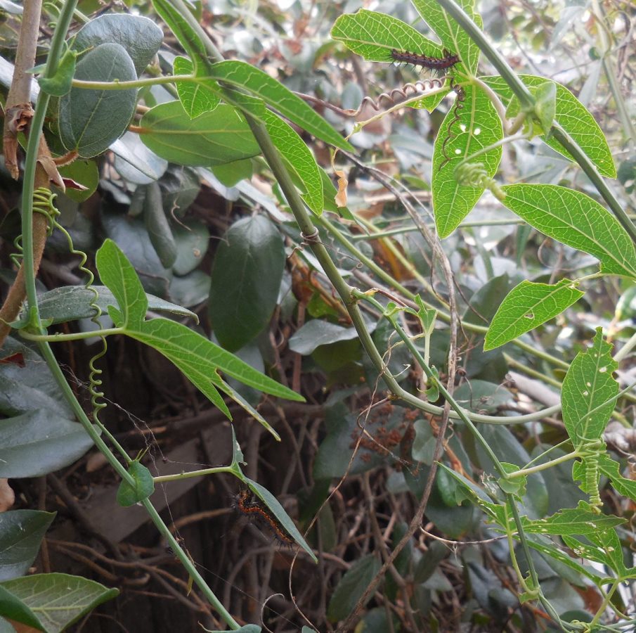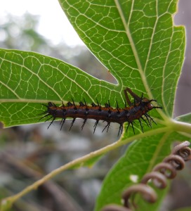(L) Introducing Leland the Gulf Fritillary caterpillar (Joe S said he looked like a 'Leland' - who am I to argue). (Center) A 2-fer - Gary, bottom left/center, Leland, top center/right. (R) Gary the Gulf Fritillary caterpillar.