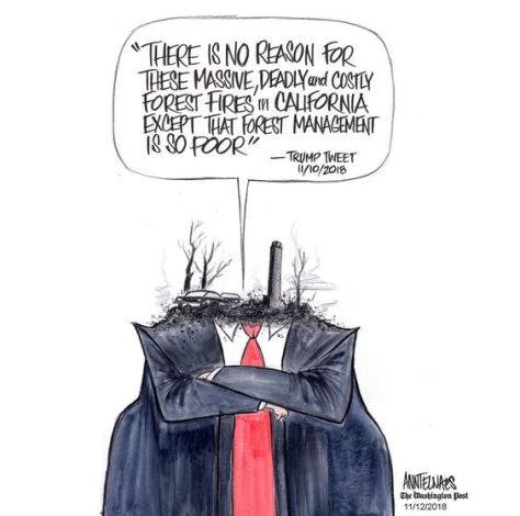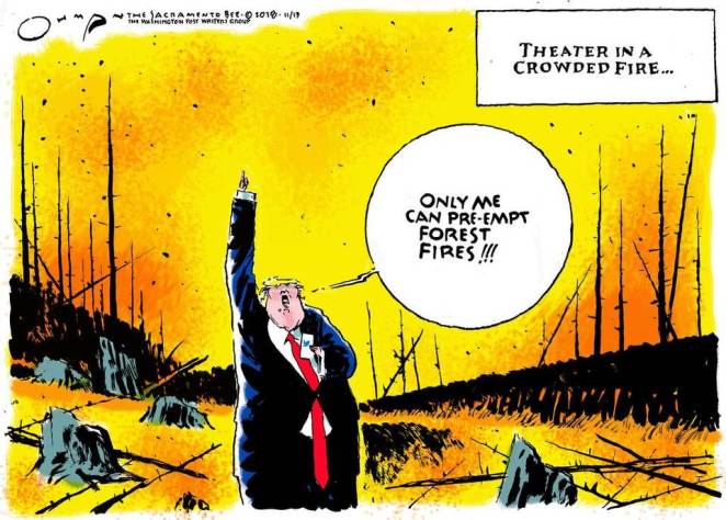 By Sunday, the devastating wildfires across California were only 25 percent contained as the death toll rose to 31 across the state. An estimated 200 people still remain missing, and in response to the disaster, President-for-now Donald Trump (R-Grabby Grifter) took the opportunity to blameCalifornia's "gross mismanagement of the forests" for the mass destruction.