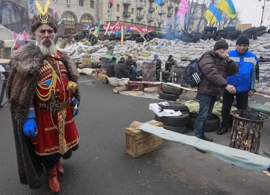 A man dressed in traditional Ukrainian Cossack clothes walks near a barricade during a rally in Independence Square in central Kiev, December 16, 2013. The opposition went ahead with preparations for another big rally for Tuesday against what they see as moves by President Viktor Yanukovich to sell out national interests to Russia after backing away from a landmark deal with the European Union that would have shifted their country westwards.