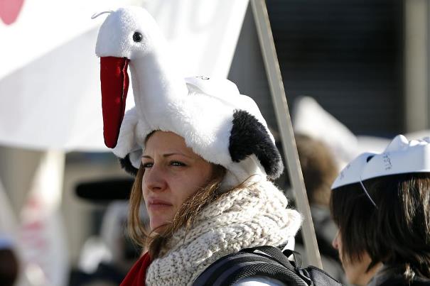 A French midwife, wearing a stork hat, attends a national protest demonstration in Paris, December 16, 2013. Midwives, gathered under the 'Storks movement, have been on strike in France for two months, demanding salary increases and better recognition by hospitals who employ them.