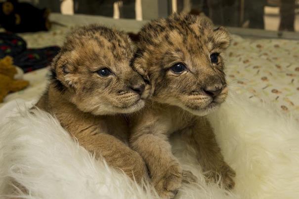 A pair of 10-day-old sibling lion cubs are seen in their play area at the San Diego Zoo and Safari Park animal care center in San Diego, California, in this December 16, 2013 handout provided by the San Diego Zoo and Safari Park. The brother and sister, whose mother Oshana was not giving them the attention they need to thrive, are receiving bottles of formula every two hours from animal care staff, according to the zoo.