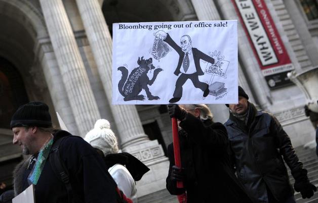 A demonstrator holds a sign outside the main branch of the New York City Public Library to protest against the library's controversial renovation plans in midtown Manhattan, December 16, 2013. The demonstrators rallied against plans to move a large part of the New York Public Library's research collection to storage in New Jersey and sell off the library's hugely popular midtown Manhattan branch.