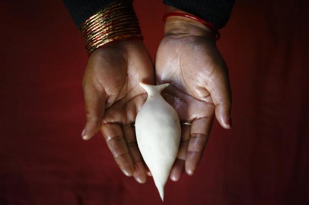 A woman shows Yamari or Yomari after she makes one, a day before the Yamari Puni festival in Kathmandu December 16, 2013. The name "Yamari Puni" originated form Newari words, "ya" meaning like, "mari" meaning delicacy and "puni" meaning full moon. People from Newar community celebrate this festival once a year during the full moon by performing traditional songs, dance and preparing Yamari also called Yomari, a confection of rice flours to be consumed specially during this day.